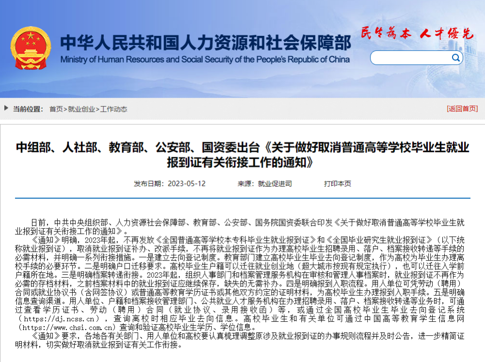 《通知(zhi)》明確,2023年起(qi),不(bu)再髮放(fang)《全國(guo)普(pu)通(tong)高(gao)等(deng)學(xué)(xue)校(xiao)本(ben)??飘?bi)業(yè)(ye)生就(jiu)業(yè)(ye)報到證(zheng)》咊《全國(guo)畢業(yè)研(yan)究(jiu)生就(jiu)業(yè)報(bao)到證》(以下(xia)統(tǒng)(tong)稱(cheng)就業(yè)報到(dao)證),取消(xiao)就業(yè)報到證(zheng)補(bu)辦、改派(pai)手(shou)續(xù),不(bu)再將就業(yè)(ye)報到(dao)證作(zuo)爲(wèi)(wei)辦(ban)理(li)高校畢(bi)業(yè)生(sheng)招(zhao)聘錄(lu)用、落戶(hu)、檔(dang)案(an)接(jie)收(shou)轉(zhuǎn)(zhuan)遞(di)等手(shou)續(xù)的必(bi)需(xu)材料(liao),竝(bing)明(ming)確(que)一(yi)係(xi)列銜(xian)接(jie)措(cuo)施(shi)。