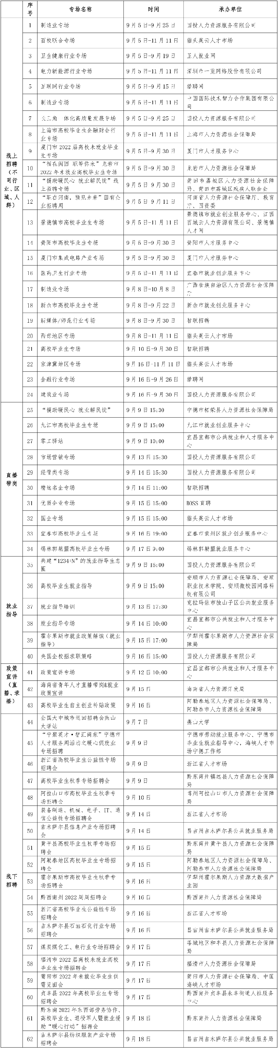 近期,人力資源社會(huì)(hui)保障部(bu)2022年大中城市聯(lián)合招聘高校畢業(yè)(ye)生秋季專場(chǎng)活動(dòng)正式啟動(dòng),首期推出62場(chǎng)特色服(fu)務(wù)活動(dòng)。包括(kuo)制造業(yè)(ye)、電力新能(neng)源、互聯(lián)網(wǎng)、金(jin)融、長(zhǎng)(zhang)三角(jiao)地區(qū)、京(jing)津冀地區(qū)等24場(chǎng)不同行業(yè)(ye)、區(qū)域、人群線(xian)上專場(chǎng)招聘會(huì)(hui),10場(chǎng)直播(bo)帶崗活動(dòng),6場(chǎng)就業(yè)指導(dǎo)直播課,3場(chǎng)(chang)高校畢業(yè)生政策宣講直播(錄播)課,19場(chǎng)線下(xia)專場(chǎng)招聘會(huì)。