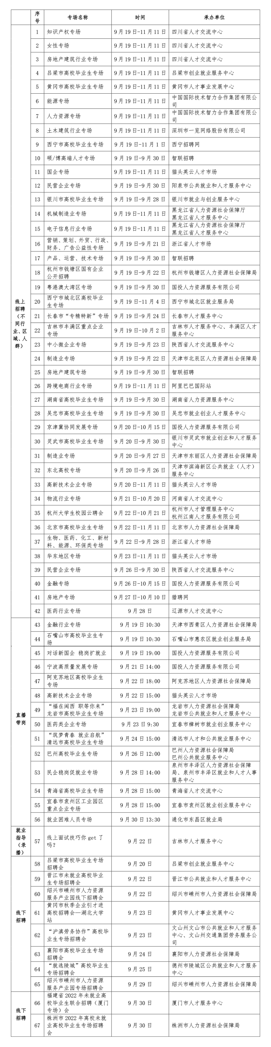 人力資源社會(huì)保障部2022年大中城(cheng)市聯(lián)合招聘高校畢業(yè)生秋季專場(chǎng)活動(dòng)近期將陸續(xù)推出第二批共67場(chǎng)特色服務(wù)活動(dòng)。其中,線(xian)上活動(dòng)57場(chǎng),包括能源、土木建(jian)筑、機(jī)(ji)械制(zhi)造、跨境電商、粵港澳大灣區(qū)等線上專場(chǎng)招聘會(huì)42場(chǎng),直播帶崗14場(chǎng),就業(yè)指導(dǎo)錄播課1場(chǎng);線下專場(chǎng)招聘會(huì)10場(chǎng)。