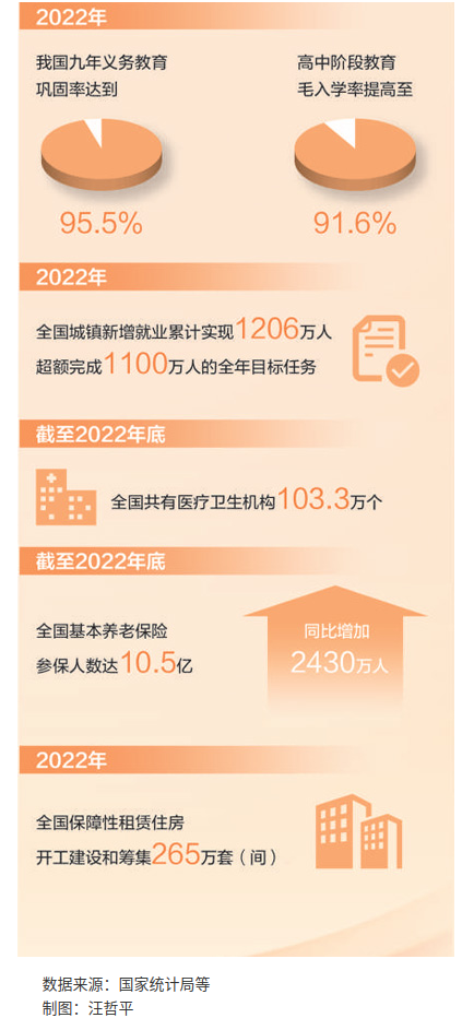 社會保(bao)障(zhang)是保障和改善民生、維(wei)護社會公平、增進人(ren)民福祉的基本制(zhi)度保障。截至2022年底,全國基本養(yǎng)老保險(xian)參保人(ren)數(shù)達10.5億,同比增加2430萬人。2022年共為2687萬困難群體代繳城鄉(xiāng)居民養(yǎng)老保險費,參保率超過99%。截至2022年末,全(quan)國共有醫(yī)(yi)療衛(wèi)生機構(gòu)103.3萬個。今(jin)年(nian)政府工作報告提出,推(tui)動優(yōu)質(zhì)醫(yī)療(liao)資源擴容下沉和區(qū)域均衡布局。