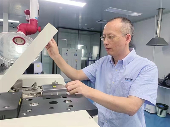 蘇州金宏氣體股份有限公(gong)司研發(fā)中心副主任孫猛博士在實(shí)驗室從事電子特氣研(yan)究。蘇州市人社局供圖