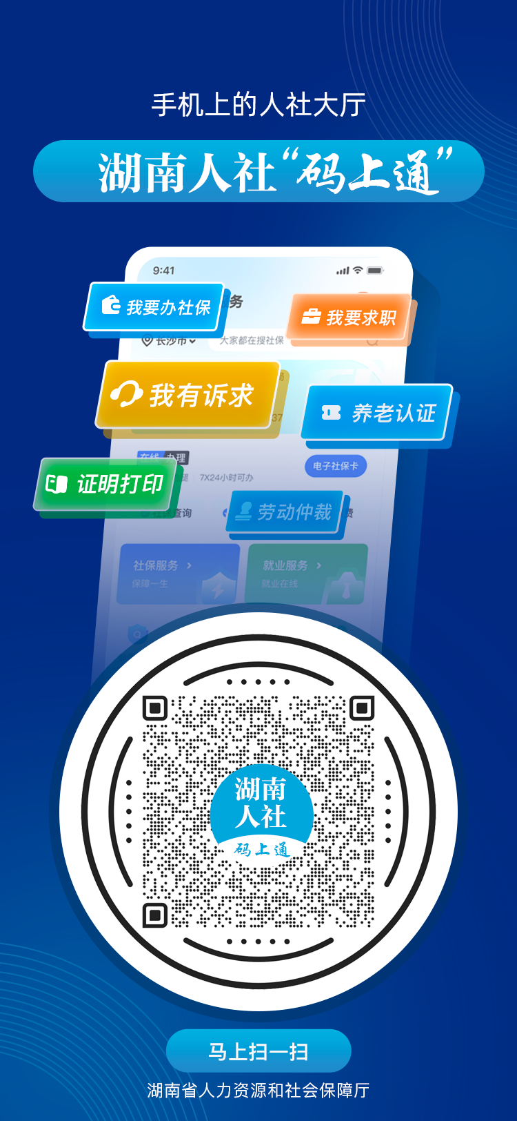 “湖南人社碼(ma)上通”開發(fā)了“我(wo)有訴求”“我要求(qiu)職”“我要辦社?!薄拔乙B(yǎng)老認(rèn)證”“我的社??ā薄拔乙?yao)查(cha)社(she)保”“我要打印”等7大功能模版,包括(kuo)拖欠農(nóng)民工工資、工(gong)資(zi)福利(li)、養(yǎng)老待遇、社保辦理、就業(yè)培(pei)訓(xùn)、勞動維權(quán)等43個高頻業(yè)(ye)務(wù)事項(xiang),群眾掃(sao)碼即可通辦。此(ci)外,首頁導(dǎo)航欄還設(shè)有“我(wo)要提問”“市州一碼通”兩大通道,方便廣大群眾咨詢、投(tou)訴、舉報。