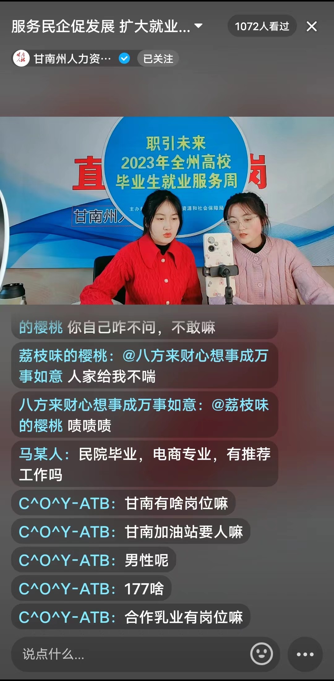 二是線上(shang)線下協(xié)同(tong)發(fā)力(li),積極開(kāi)展信息發(fā)布。在甘(gan)肅人才(cai)網(wǎng)(wang)甘南分站發(fā)布招(zhao)聘會(huì)公告,為企業(yè)提供網(wǎng)上招聘服務(wù)。加大直播帶崗頻次,州(zhou)縣人社部門(mén)在(zai)線為高校畢(bi)業(yè)生(sheng)介紹崗(gang)位、解讀就業(yè)政(zheng)策,提供就業(yè)擇業(yè)指導(dǎo)服務(wù)。截至活動(dòng)結(jié)束,共開(kāi)展(zhan)直播帶崗6場(chǎng)次,在線觀看(kan)累(lei)計(jì)1.7萬(wàn)多人次;政策宣講6場(chǎng)次,在線觀看累(lei)計(jì)2.3萬(wàn)多(duo)人(ren)次;提供就業(yè)(ye)指導(dǎo)服(fu)務(wù)5場(chǎng)次,在線觀看人數(shù)(shu)累計(jì)2.2萬(wàn)多人次。
