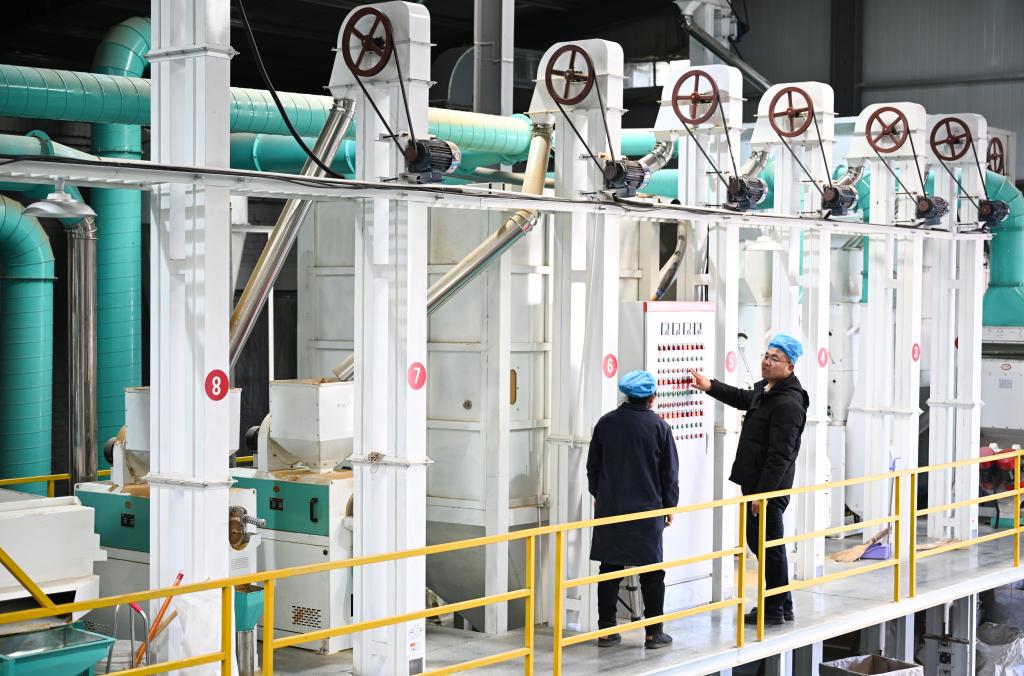 2025年(nian)1月(yue)10日(ri),“95后”返(fan)鄕(xiang)創(chuàng)業(yè)大(da)學(xué)(xue)生(sheng)任宏(hong)宇(yu)(右(you))在(zai)陝西(xi)省(sheng)榆(yu)林(lin)市(shi)米(mi)脂縣(xian)米森辳業(yè)髮展有限公(gong)司(si)的生産(chan)車(chē)間與工(gong)人(ren)交流(liu)設(shè)(she)備(bei)運(yùn)(yun)行(xing)情況。新華(hua)社(she)記者張(zhang)愽(bo)文 攝