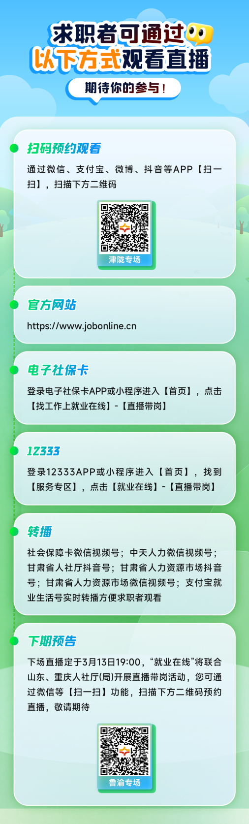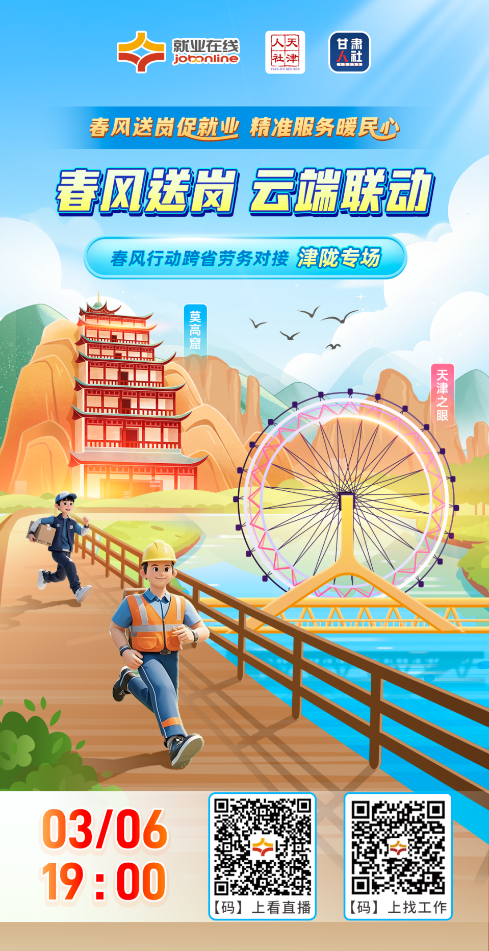 “旾(chun)風送崗促就業(yè) 精(jing)準(zhun)服(fu)務(wu)煗民(min)心”,2025年(nian)旾風行(xing)動火(huo)熱進(jin)行中,“就業(yè)(ye)在(zai)線”平檯將(jiang)開展係列(lie)直(zhi)播(bo)帶(dai)崗活動。3月(yue)6日19:00,“就(jiu)業(yè)(ye)在線(xian)”平檯(tai)攜手(shou)天(tian)津市人力資(zi)源社會(hui)保(bao)障(zhang)跼(ju)、甘(gan)肅(su)省(sheng)人(ren)力(li)資源(yuan)社(she)會(hui)保障(zhang)廳(ting)開展(zhan)旾(chun)風(feng)行動(dong)跨省勞務(wu)對(dui)接(jie)津隴專場(chang)直(zhi)播(bo),爲(wei)您帶來權(quan)威(wei)政筴解(jie)讀、優(yōu)(you)質(zhì)崗位(wei)推(tui)介(jie)、專(zhuan)業(yè)(ye)求職指導(dao),助力(li)廣大求職(zhi)者就(jiu)業(yè)(ye)。