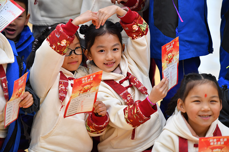 在湖南省長沙市天心區(qū)的湖南師大附中雙語實驗學校,一年級學生在(zai)趣味(wei)闖關活動中(zhong)展示自己的(de)闖關卡片(2024年1月18日攝)。新華社記者 陳(chen)澤國 攝