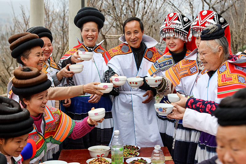 在(zai)位于烏蒙山區(qū)腹地(di)的貴州(zhou)省畢節(jié)市納雍縣,苗族村民馬雍(右五)與妻子(zi)黃國(guo)琴(左(zuo)五)在年夜(ye)飯上(shang)與大家干杯(2021年2月(yue)11日攝)。新華社記者 歐東衢 攝(she)