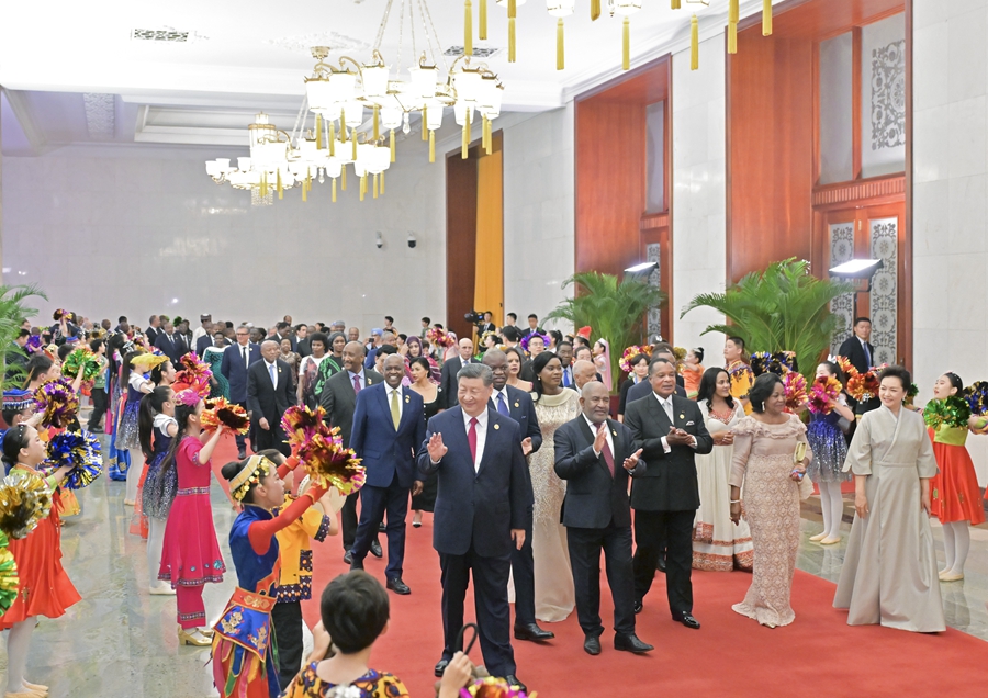 9月4日晚,國(guó)家主席習(xí)近平和(he)夫人彭麗媛在北京人民大會(huì)堂舉行宴會(huì),歡迎來華出席中非合作論壇(tan)北京峰會(huì)的非方及國(guó)際貴賓。這是習(xí)近平和(he)彭麗媛同貴賓們共同(tong)步入宴會(huì)廳(ting)。新(xin)華社記者 翟健嵐 攝