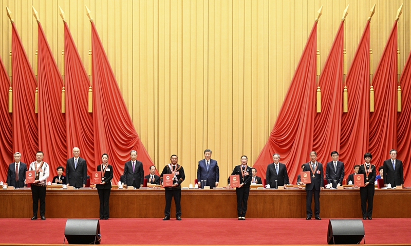 9月(yue)27日,全(quan)國民族團(tuán)結(jié)進(jìn)步表彰大會在(zai)北京舉行。這(zhe)是習(xí)近(jin)平(ping)等為受表彰的模范個人和模范集體代表頒獎。新華社記者 鞠鵬 攝