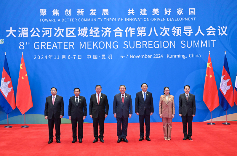 11月7日,國(guó)務(wù)院(yuan)總理李強(qiáng)在昆明出席大湄公河次區(qū)域經(jīng)濟(jì)合作第八次領(lǐng)導(dǎo)人會(huì)議。這是李強(qiáng)同出席會(huì)議的(de)柬埔寨、老(lao)撾、緬(mian)甸、泰國(guó)、越南政府(fu)首腦和亞洲開(kāi)發(fā)銀行行長(zhǎng)合影。新華社記者 殷博古 攝