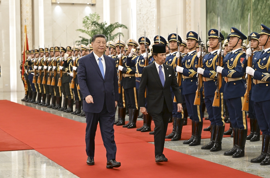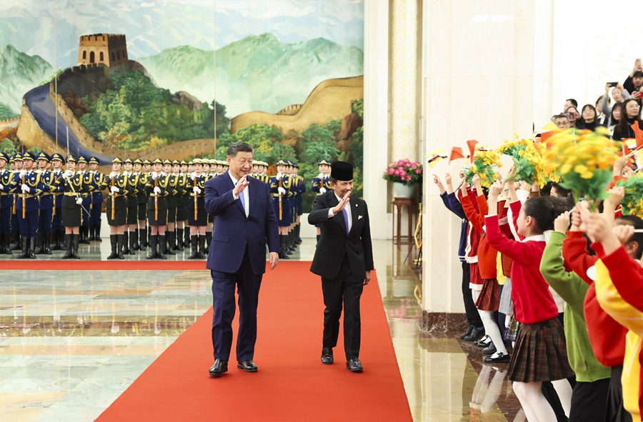 2月6日上午,國家主席習(xí)近平在北(bei)京人民大會堂同來華進(jìn)行國事訪問的文萊蘇丹哈(ha)桑納爾(er)舉行會談。這是(shi)會談前,習(xí)近平在人民大會堂北大(da)廳為哈桑納爾舉行歡迎(ying)儀(yi)式(shi)。新華(hua)社記者 李響 攝