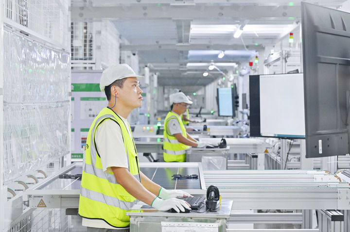 工人在(zai)位于浙江省樂清市的正泰(tai)集團8GW高效光伏組件生產(chǎn)基地工作(資料照片)。新華社發(fā)(fa)