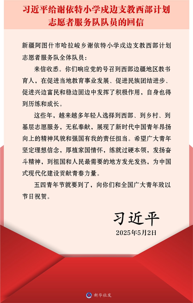 新(xin)華社北京5月3日電? 在五四青(qing)年節(jié)到來之際,中共中央總書記、國家主席、中央軍委主席習(xí)近平給新(xin)疆克孜勒蘇(su)柯爾克孜(zi)自治州阿圖什市哈拉峻(jun)鄉(xiāng)謝依特小學(xué)戍邊支教西部計(jì)劃志愿者服務(wù)隊(duì)全體隊(duì)員(yuan)回信,向(xiang)全國廣大青(qing)年(nian)致以節(jié)日祝賀并提出殷切期望(wang)。